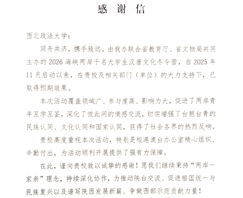 省委台办专函感谢我校助力2026海峡两岸千名大学生汉唐文化冬令营