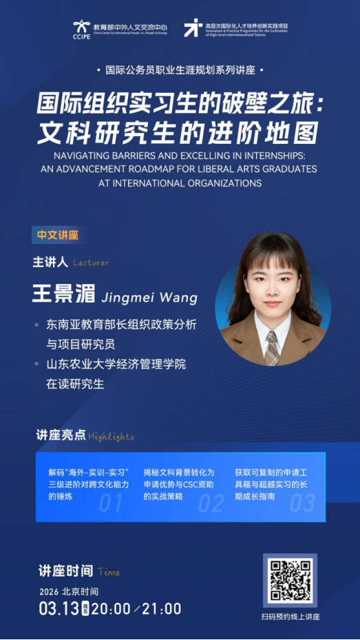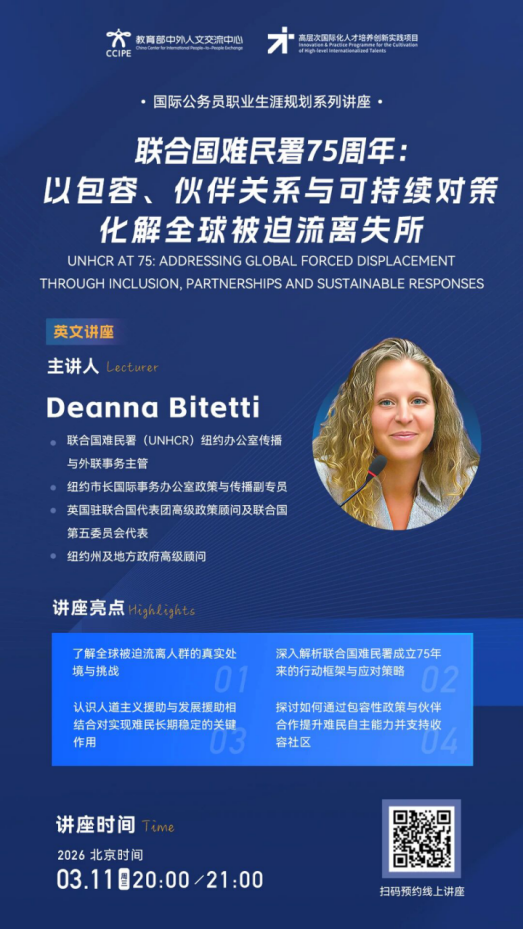 第一期系列讲座将于2026年3月11日至3月13日在线进行,邀请联合国难民署纽约办公室传播与外联事务主管Deanna Bitetti女士、国际劳工组织国际培训中心发展与投资处项目官员李思璇女士、东南亚教育部长组织政策分析与项目研究员王景湄女士等主讲人介绍联合国难民署工作机制,分享国际公务员专业技能和国际组织实习经历,讲座具体信息详见海报。