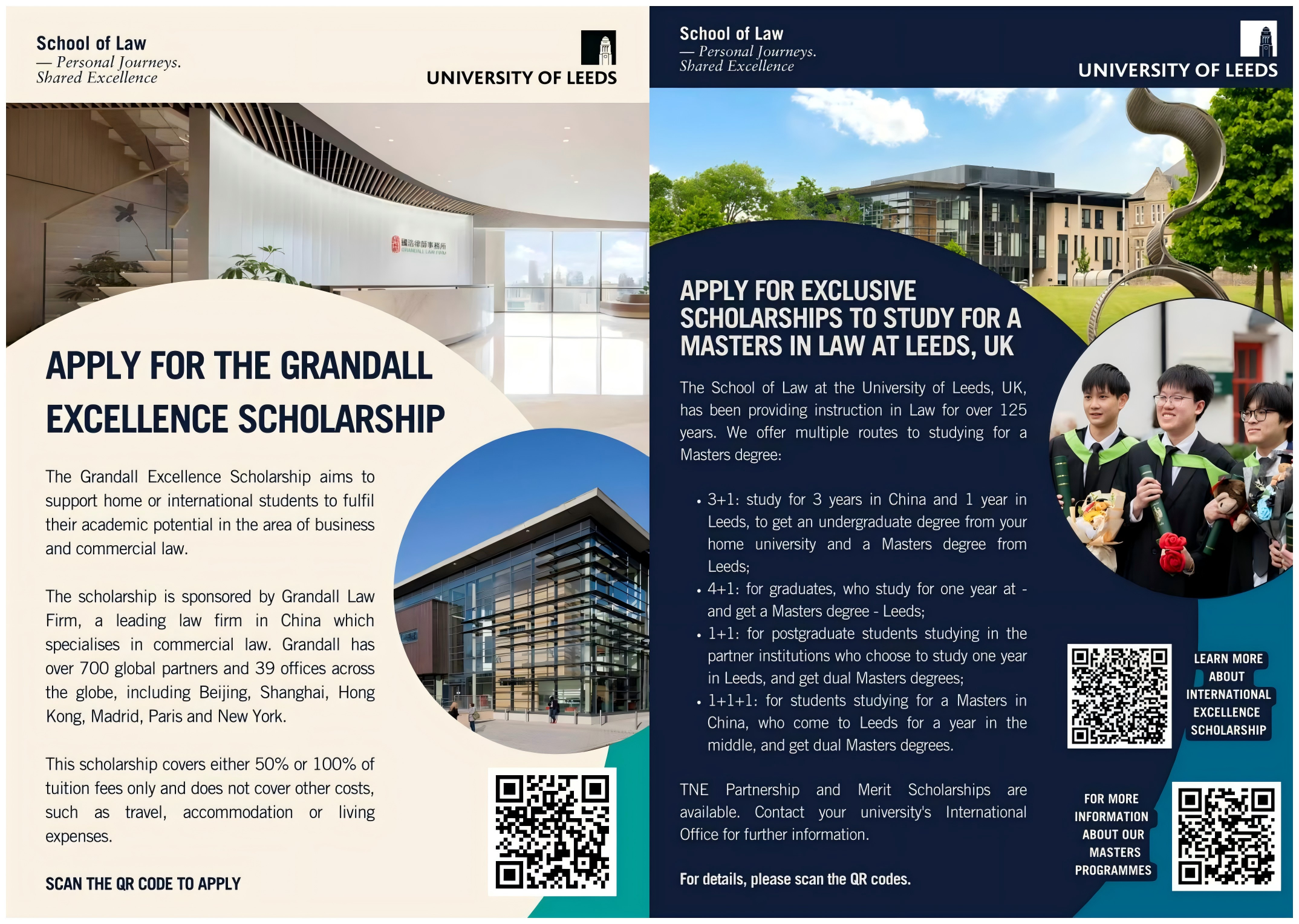 我校与利兹大学合作开展法学“3+1/4+1”本硕连读学位项目以及“1+1+1/2+1”双硕士学位项目。利兹大学将为我校录取学生提供合作院校奖学金(学费的20%),该项奖学金无需单独申请。此外,被录取的学生还可申请“国浩卓越奖学金”(The Grandall Excellence Scholarship),该奖项可覆盖学费的50%或100%。根据利兹大学规定,上述两类奖学金不可叠加享受。