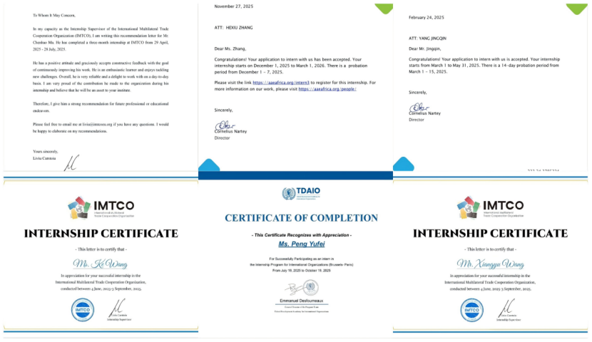 我校学生2025年非洲企业家协会、国际多边贸易合作组织、国际组织人才发展学会实习录取信及证书